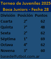Boca Juniors es el puntero de la tabla acumulada del Torneo de Juveniles de la Liga Profesional. Con 28 fechas disputadas, las categorías juveniles del “Xeneize” suman en total 363 puntos, ubicándose por encima de River Plate (segundo) y Rosario Central (tercero).